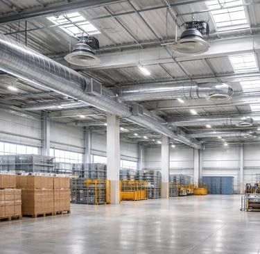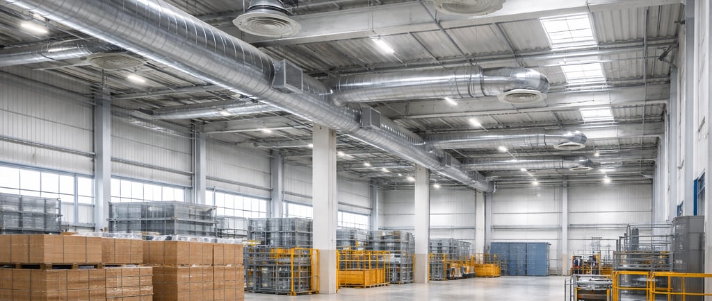 Unlike offices, industrial spaces require high-capacity ventilation systems designed for volume and durability.